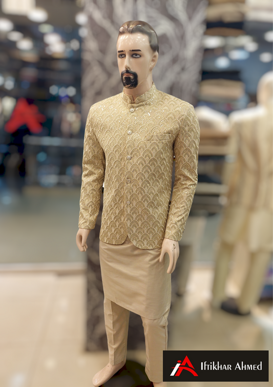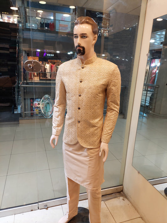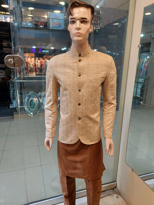 Beige Prince Coat - Masoori Fabric , Dark Brown Kurta Pajama