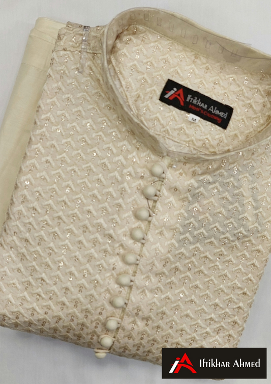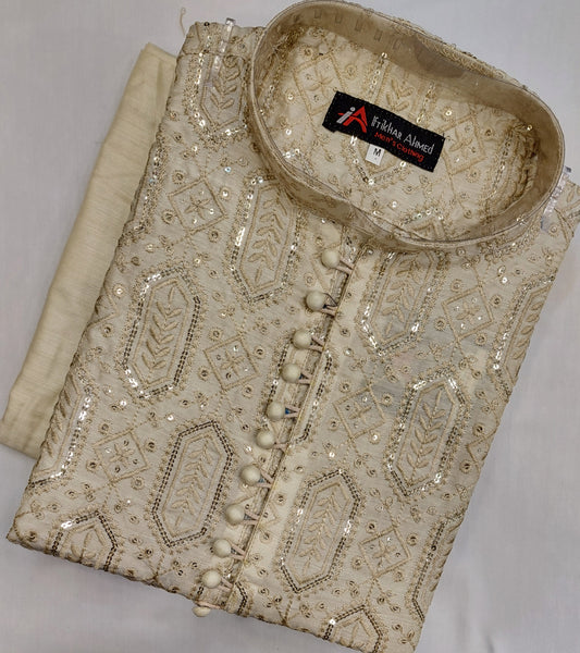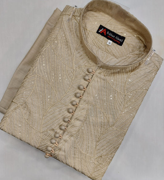 Beige - Kurta Pajama - Masoori Sequence Work - Cotton Silk Fabric