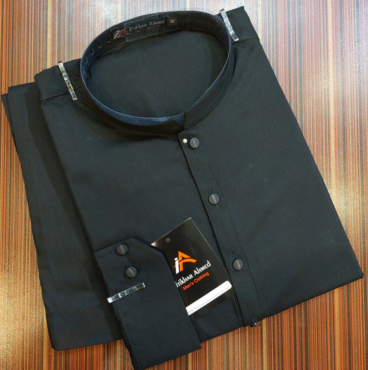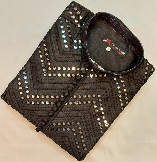 Black Kurta Pajama - Masoori Sequence Work- Raw Silk Fabric