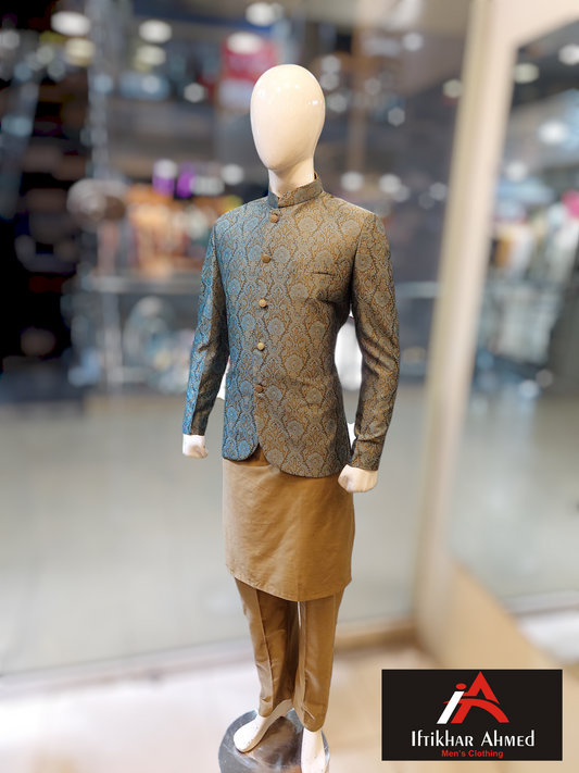 Sea Green with Copper Emboss Prince Coat - Jamawar Fabric