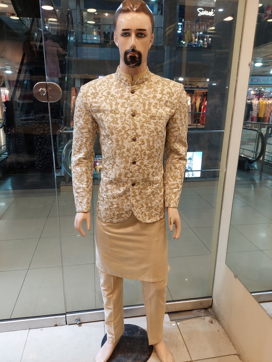 White Prince Coat with Golden Embroidery - Masoori Fabric