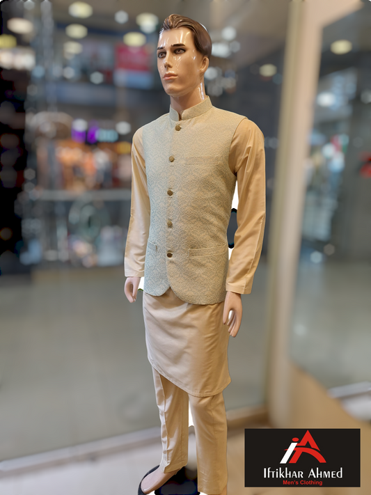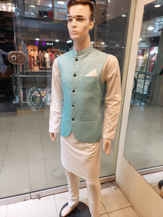 Turquoise blue with White Embose Waist Coat – Jamawar