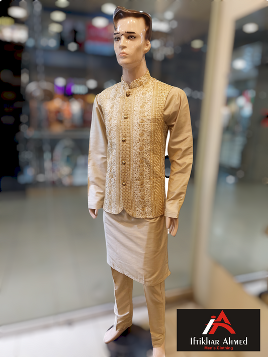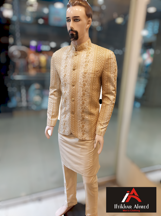 White With Beige Sequence Emboidery Prince Coat - Masoori Fabric