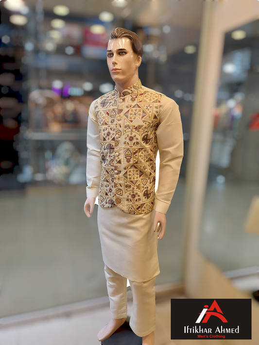 Cream With Same Embroidery - Open Style Prince Coat - Masoori Fabric