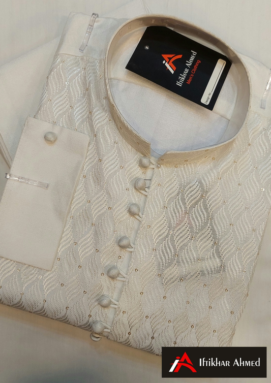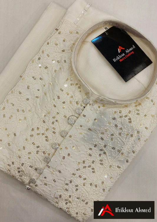 Milky White - Kurta Pajama - Masoori Sequence Work- Raw Silk Fabric