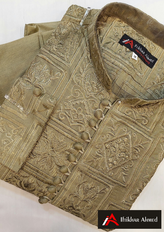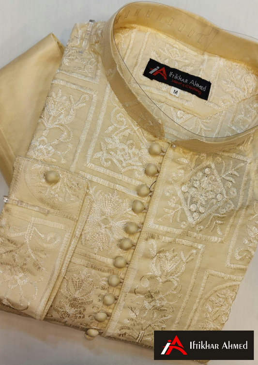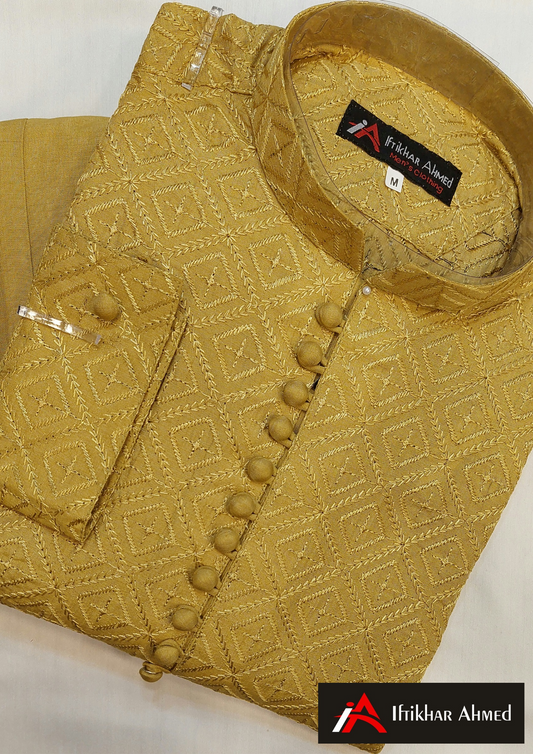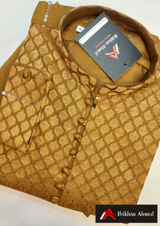 Dark Golden Kurta Pajama - Masoori Work- Cotton Silk Fabric