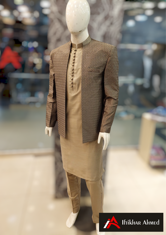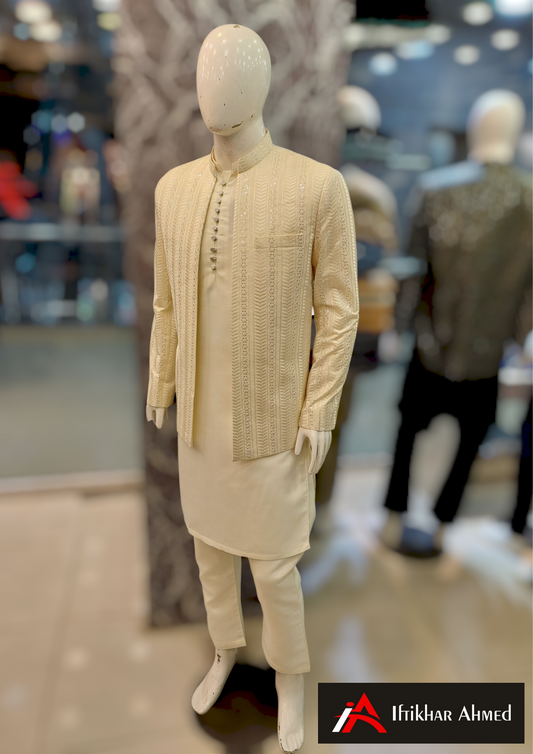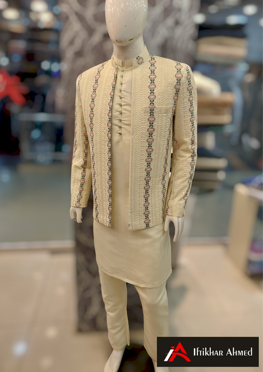 Cream With Same Embroidery - Open Style Prince Coat - Masoori Fabric