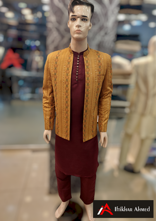 Mustard With Mustard & Maroon Embroidery - Open Style - Prince Coat - Masoori Fabric