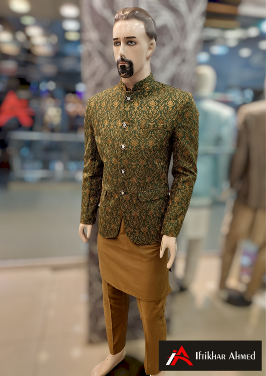 Green With Copper Embroidery - Open Style Prince Coat - Masoori Fabric