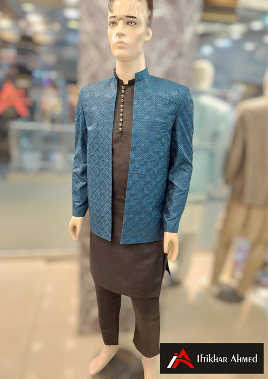 Sky Blue With Same Embroidery Open Style Prince Coat - Masoori Fabric