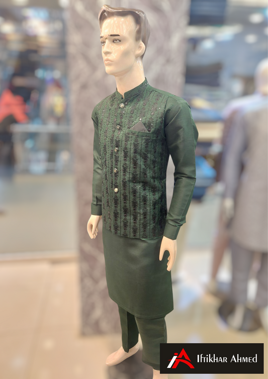 Bottle Green with Black Embroidery - Waist Coat - Masoori Fabric