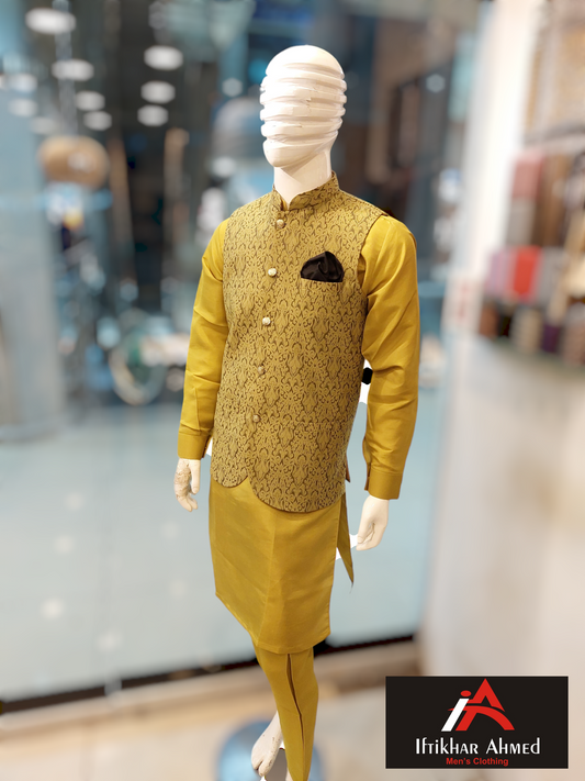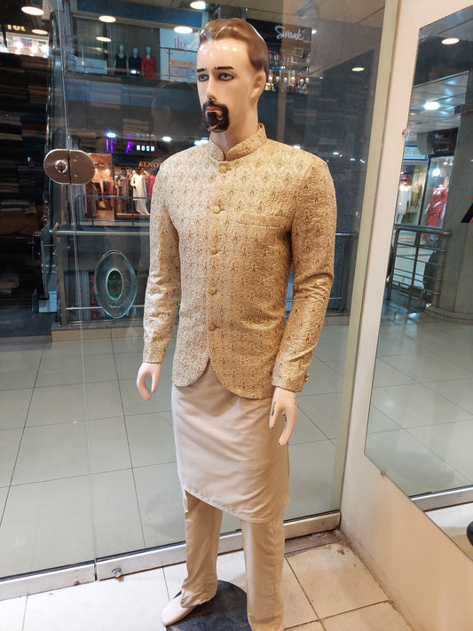 Golden with Light Fawn Emboidery Prince Coat - Masoori Fabric