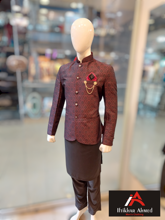 Dark Maroon with Black Embroidery - Prince Coat fabric Embose