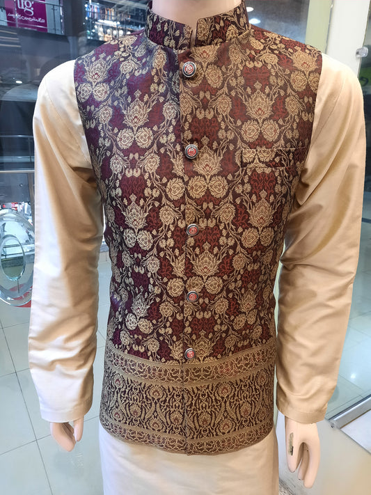 Maroon Waist Coat with Golden Boti & Border - Atlas Zaari Fabric