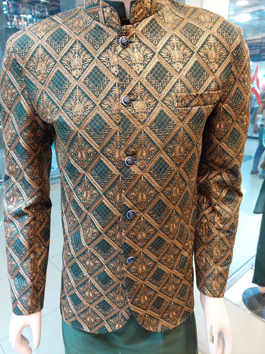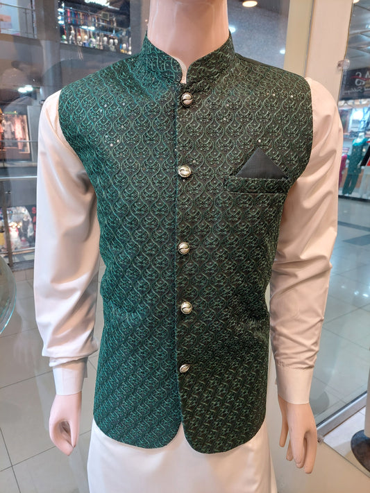Dark Green Waist Coat, Embroidery Pattern - Masoori Fabric