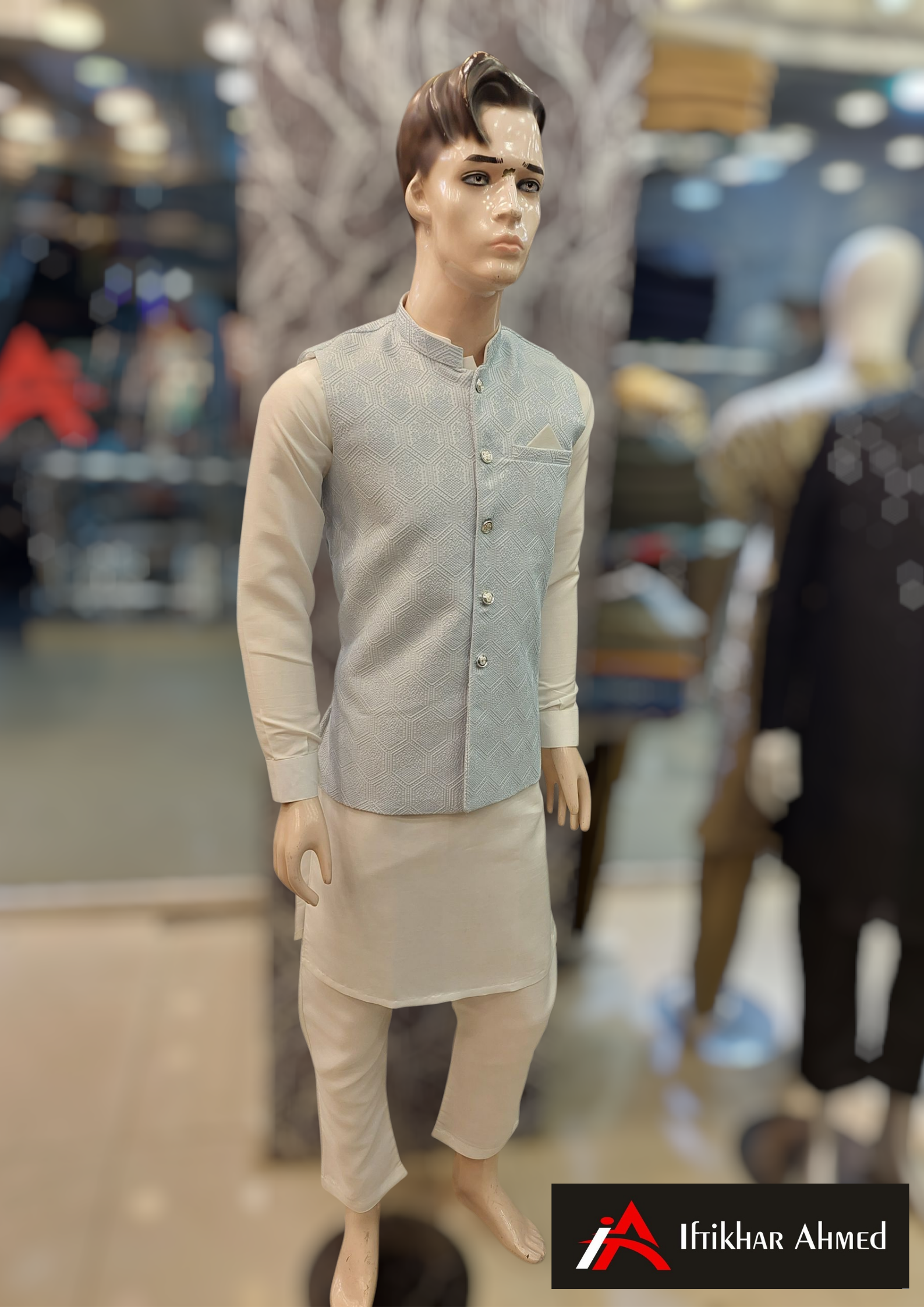 White With Sky Blue Embroidery - Waist Coat – MDC Fabric