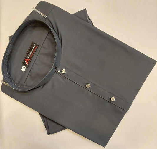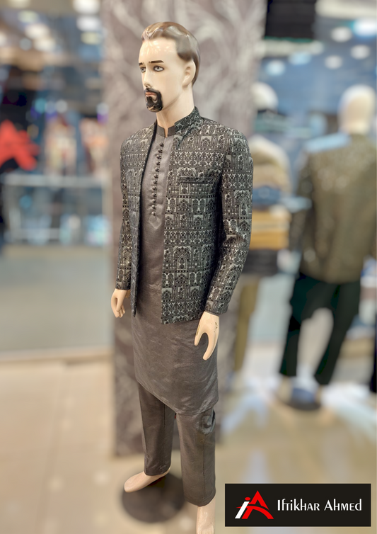 Charcoal Grey With Black Embroidery - Open Style Prince Coat - Masoori Fabric