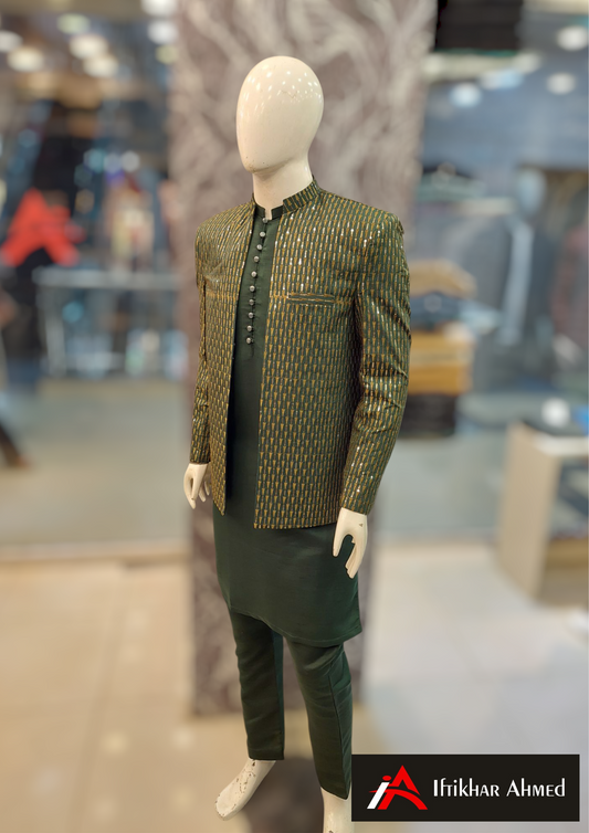 Green With Copper Embroidery - Open Style Prince Coat - Masoori Fabric